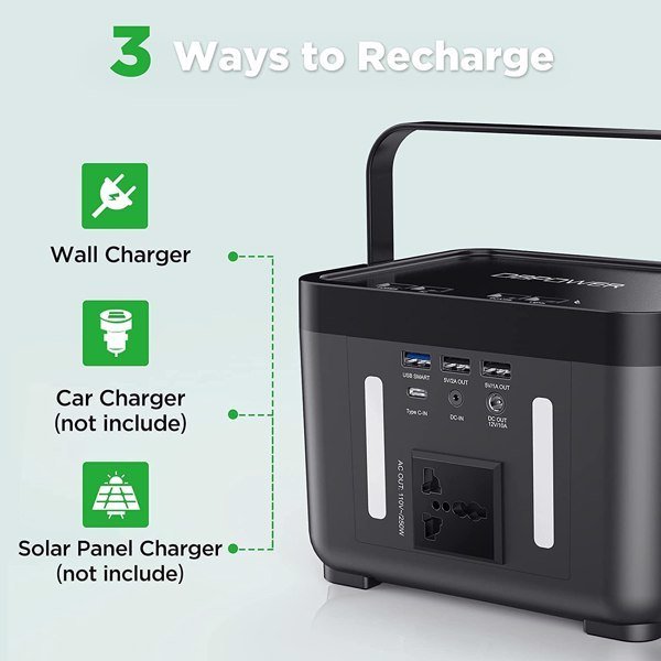 [ 3 CHARGE & LIGHT MODES ] The rechargeable battery backup power supply with 3 charge methods: 110V wall socket; 12V/24V car cigarette socket (not included); 15V/2A solar panel (not included). No memory effect; no worry about battery capacity reduction. This camping power station featured with 3 modes built-in LED flashlight: lighting; SOS and strobe is good for emergency use while being outdoors.
