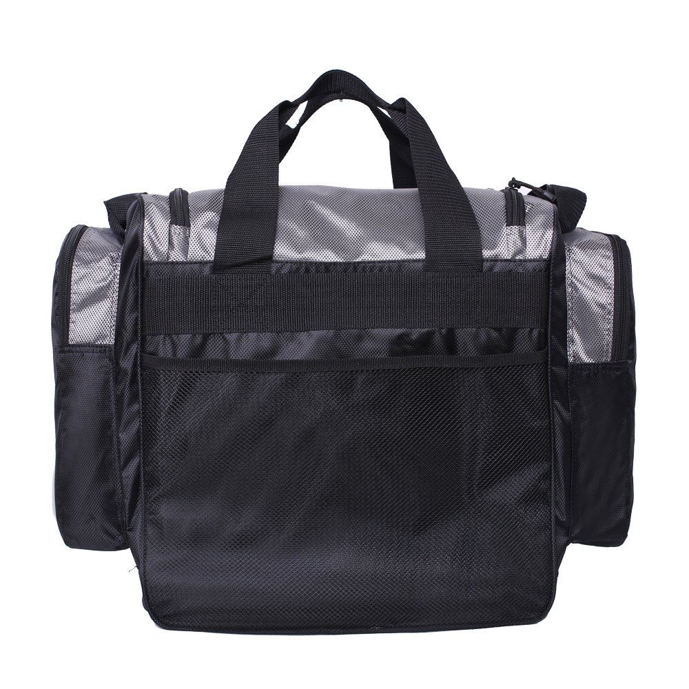 2.Quick Access Gear Bag-Main pocket size:14.6”*10.6”*14.2”,can holds up to stores up to (7) 3700 size tackle trays. 2 side pocket size:11.8"*7.8"*2",1 front pocket size:13.4"*8.6" and 1 mesh pocket which can hold fishing tackles like lure boxes,hook ,fish line,scissors and other things like.