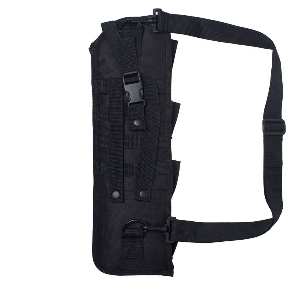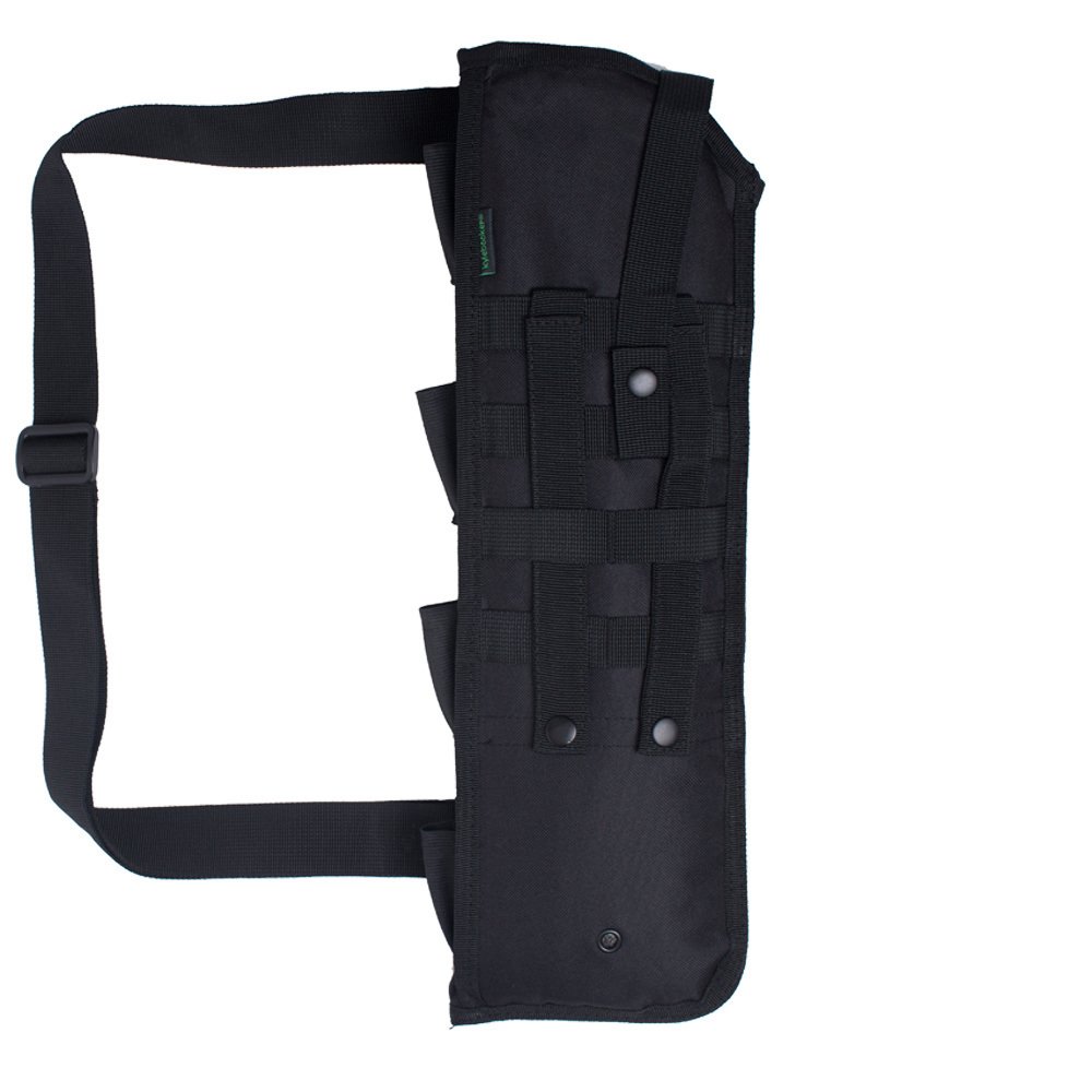 This is Tactical Shotgun Scabbard have two MOLLE straps on each side allow for ambidextrous mounting to your entry vest, plate carrier or chest rig. The weapon can also be slung with the padded, adjustable, and removable shoulder strap. The scabbard is padded to protect the weapon in tight spaces.