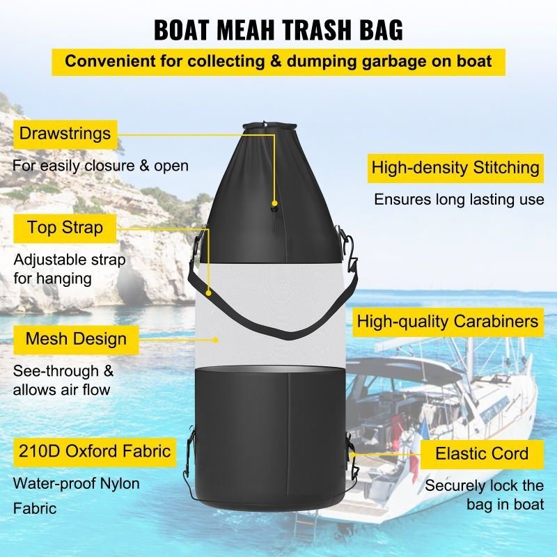 We considerately provide a 25.6 x 10.2 inches boat trash bag for your convenient use. The ample space can easily accommodate plenty of waste such as bottles, cans, etc. Although the trash bag is designed for t-top boat accessories, it is multipurpose and can be also used in camping and outdoor activities.