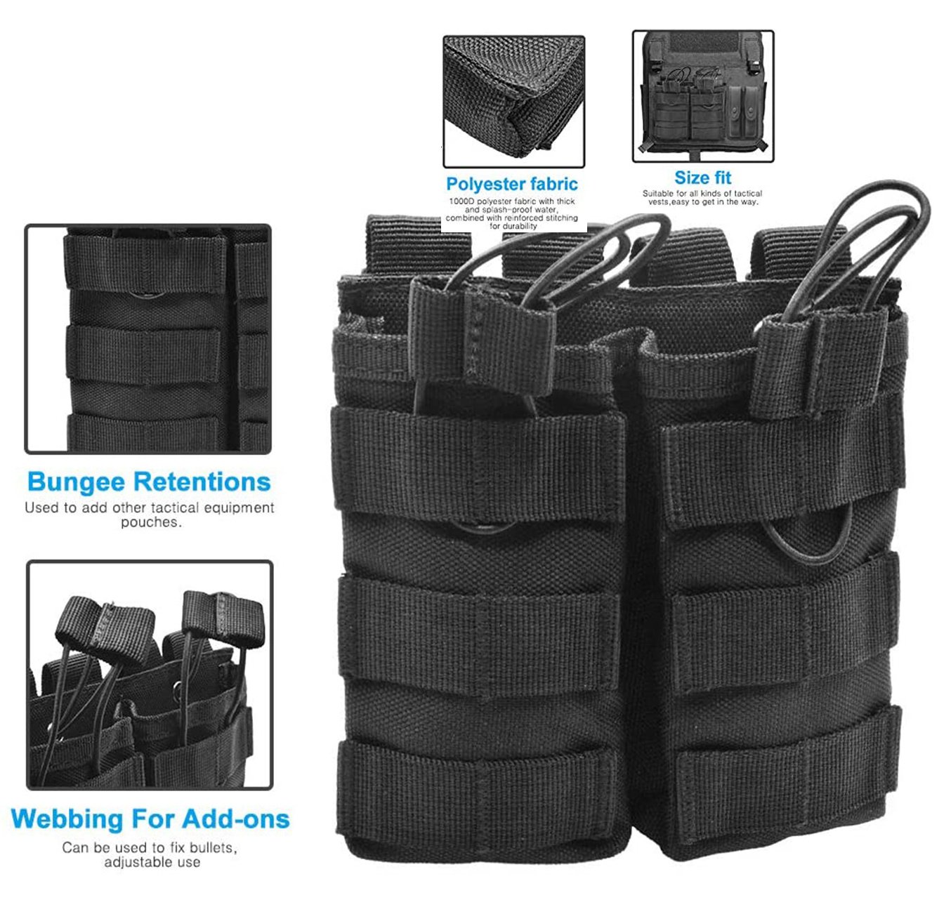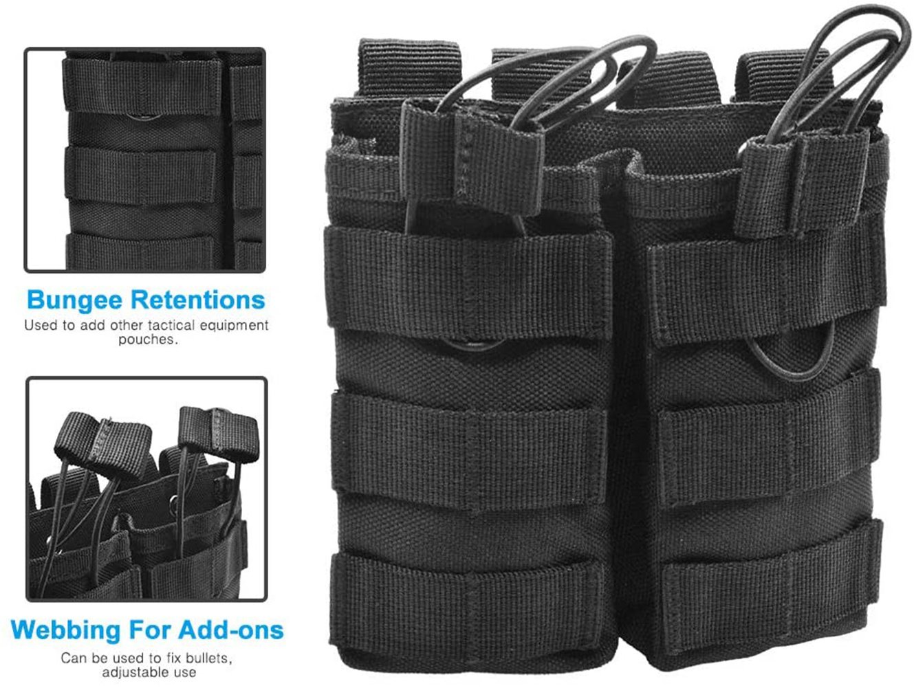 | Ideal For Anyone Using The Lightweight And Minimalist Mindset To Determine Your Loadout Lightweight and low profile airsoft mag pouch -- let you leave the pouch in when not storing mags without the extra bulk | TRIPLE OPEN-TOP MAG POUCH This mag holder will carry two mags, suitable for most of the small caliber rifle magazine, including but not limited to 30-round M4/M16 magazines, HK416 magazines Specifications Material: 1000D Nylon | RACHSA MAG POUCH Molle webbing on the front allows you to expand carrying capacity. Molle straps on the back can simply be attached to your tactical belt, military vests, backpack, radio pouch, rifle case, magazine holster,molle mag pouch etc. |