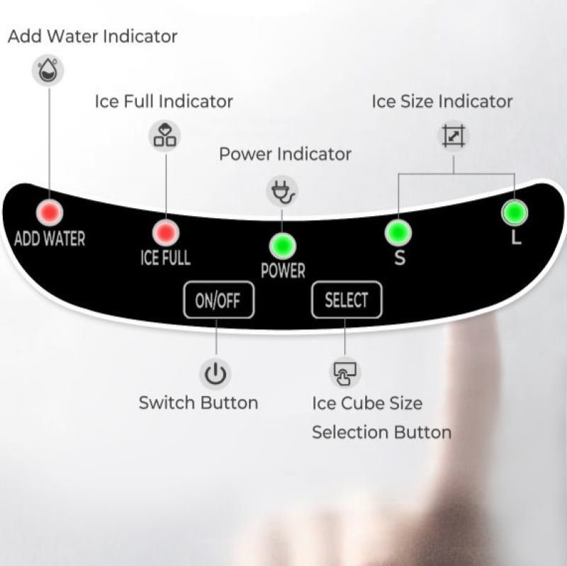3.The top panel of ice machine is simple to operate and features smart indicator lights that will remind you when the ice basket is full and when you need to add water.
