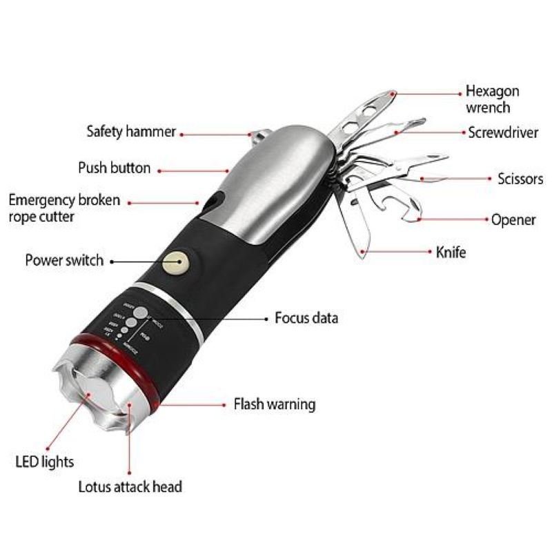Multi-Tool Combination: Knife; Bottle Opener; Scissors; Cross Screwdriver; Hexagon Wrench; Slotted Screwdriver; Safety Hammer; Seat Belt Cutter Blade; Flashlight